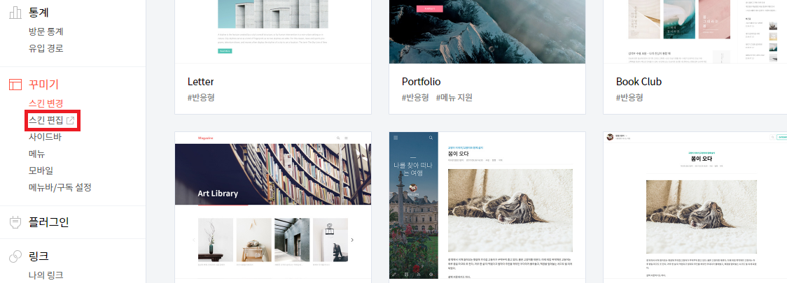 4. 티스토리 블로그 설정 화면에서 스킨 편집 버튼을 눌러줍니다.(이 정도는 다들 아실 거라 생각합니다)