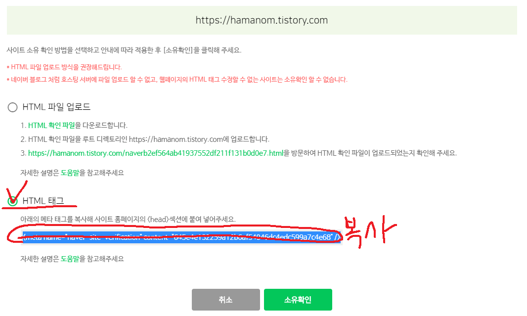 3. 아래에 HTML 태그 버튼을 체크해 주신 후에 파란색으로 드래그되어있는 메타태그를 복사해줍니다.