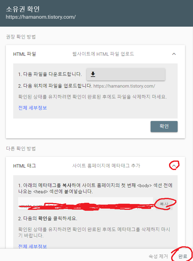 4. HTML 태그 우측 버튼을 누른 후에 메타태그를 복사해주세요.