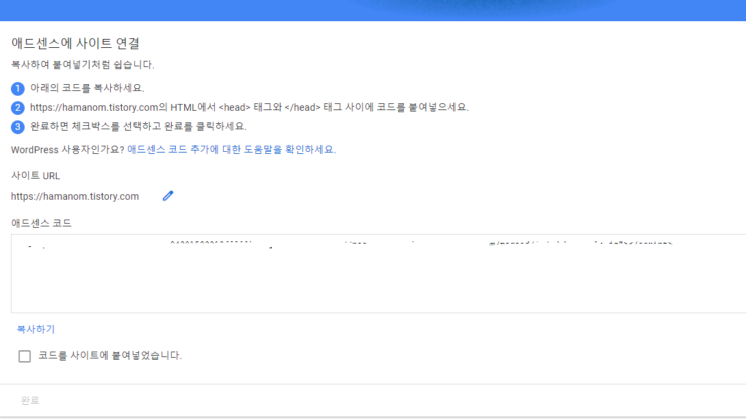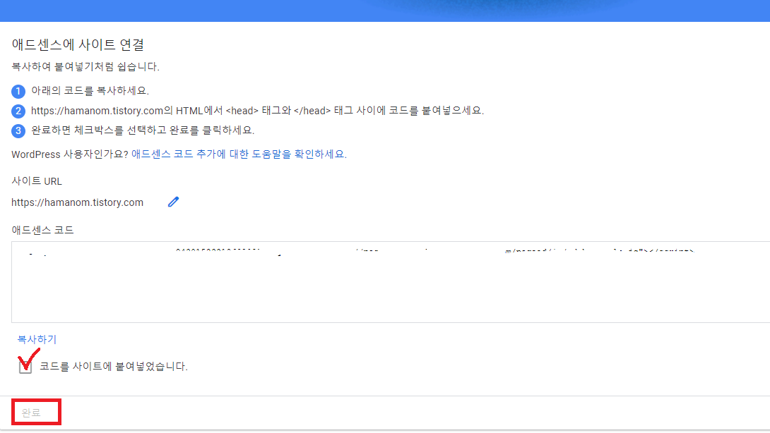 9. 코드를 사이트에 붙여 넣었습니다. 체크 후 완료 버튼을 눌러줍니다.