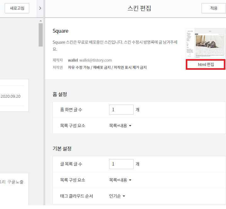 7. 항상 스킨 편집 버튼을 누른 후에 찾아오는 HTML 버튼을 눌러줍니다.