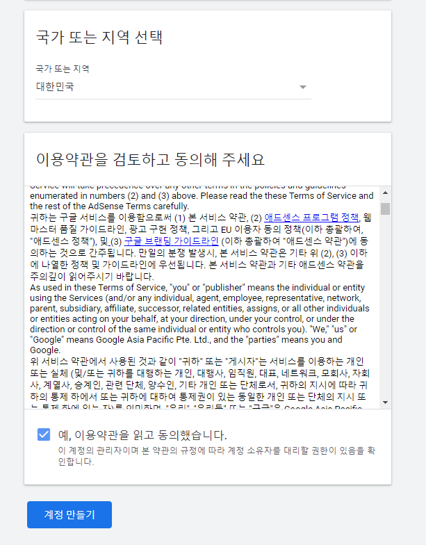 3. 국가 선택, 약관 동의 후에 하단 계정 만들기 버튼을 눌러줍니다.