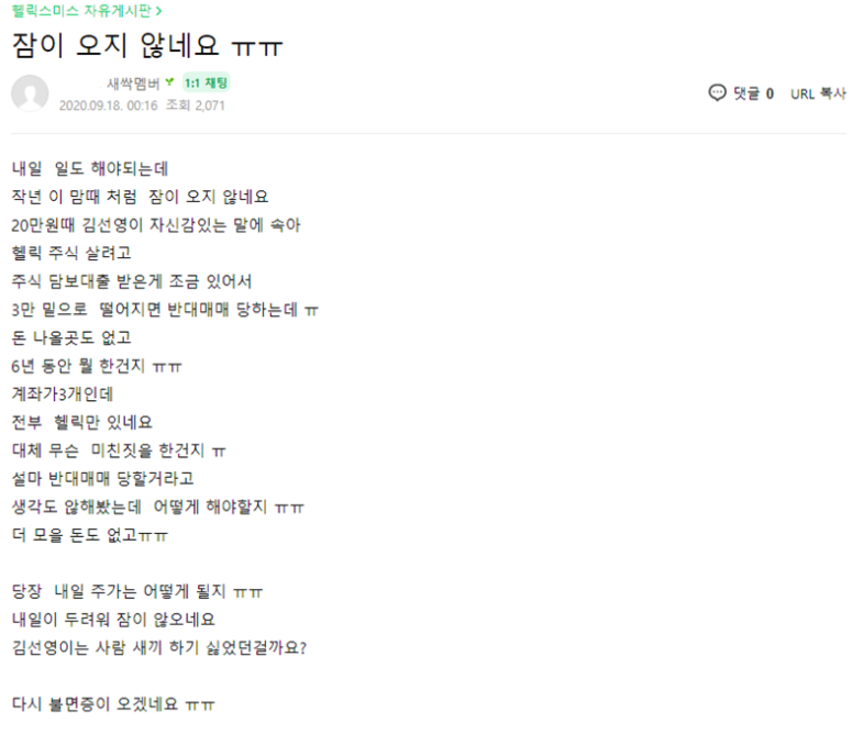 헬릭스미스의 유상증자 번복으로 인한 주가 폭락으로 잠을 주무시지 못하는 우리의 주주님