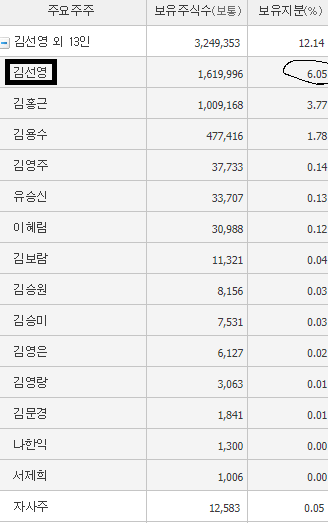 아, 김선영씨는 무려 6%를 보유 중이신 대주주이십니다.