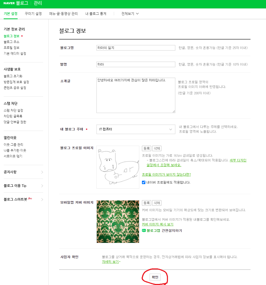 블로그를 막 만들었다면 모두 기본정보로 기재되어있으니 하나하나 적어서 수정하고 맨 아래 확인 버튼을 눌러줍니다.