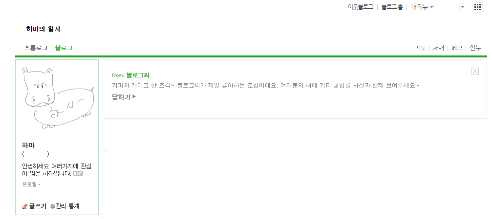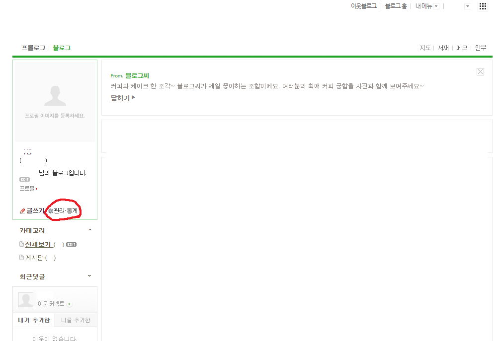 내 블로그의 기본적인 메인 화면입니다. 좌측 프로필 박스 아래에 글쓰기 옆을 보시면 관리 통계라는 버튼이 있습니다.
